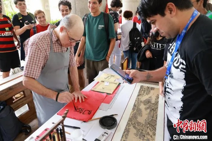 出于對武術的熱愛,他開始鉆研與中國有關的一切。但他真正接觸中華文化是在結識巴西當?shù)氐娜A人家庭之后。當時,他經常前往華人開設的商店尋找漢字描摹。一位店主目睹了他“作畫”一般的寫字過程后大吃一驚,于是開始教授他漢字筆畫與筆順,一來二去,他與店主一家和社區(qū)的其他華人家庭結下深厚友誼。