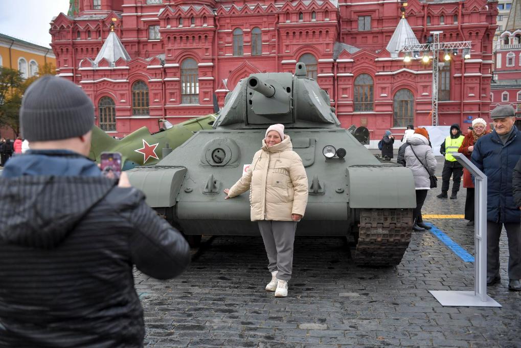 11月7日,在俄羅斯首都莫斯科,一名女子在以紀(jì)念1941年蘇聯(lián)紅場閱兵式為主題的露天展覽上留影。新華社發(fā)(亞歷山大攝)