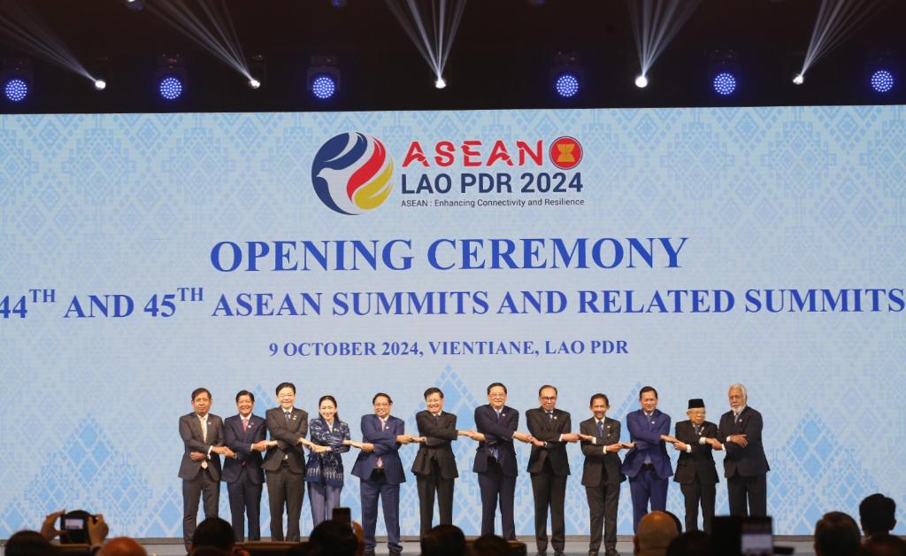 這是10月9日在老撾首都萬象拍攝的第44屆和第45屆東盟峰會(huì)開幕式現(xiàn)場(chǎng)。新華社發(fā)