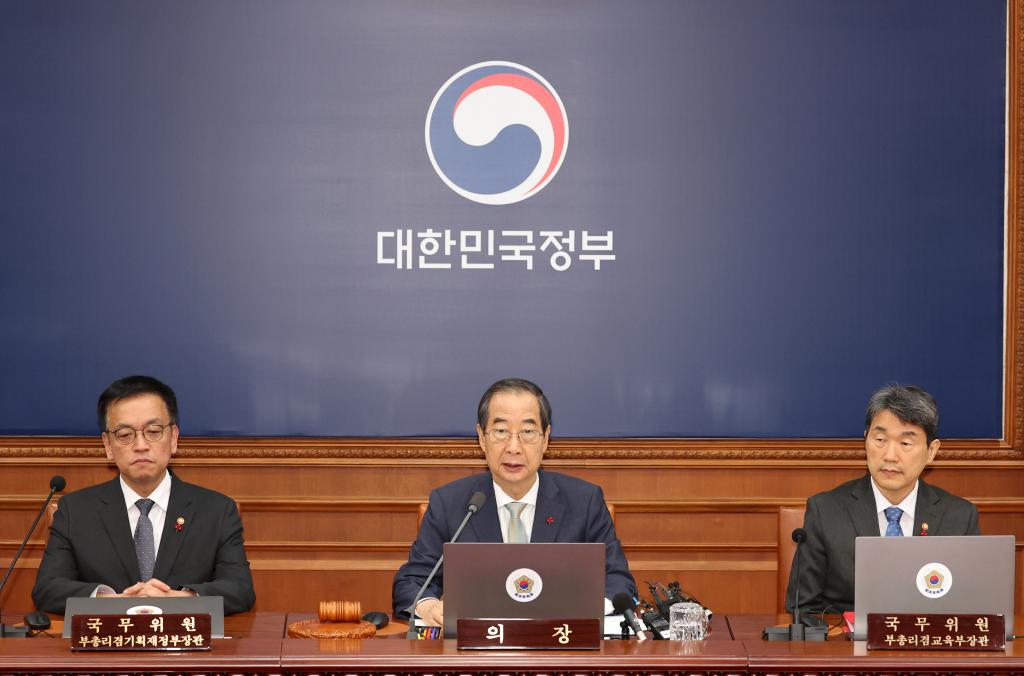 12月14日,在韓國首都首爾,代行總統(tǒng)職權(quán)的韓國國務總理韓德洙(中)召開臨時國務會議。新華社/紐西斯通訊社