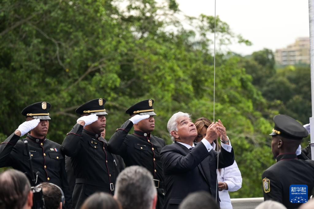 12月31日,巴拿馬總統(tǒng)穆利諾(中)在首都巴拿馬城舉行的正式收回巴拿馬運河主權(quán)25周年紀(jì)念活動上升起國旗。新華社記者 陳昊佺 攝