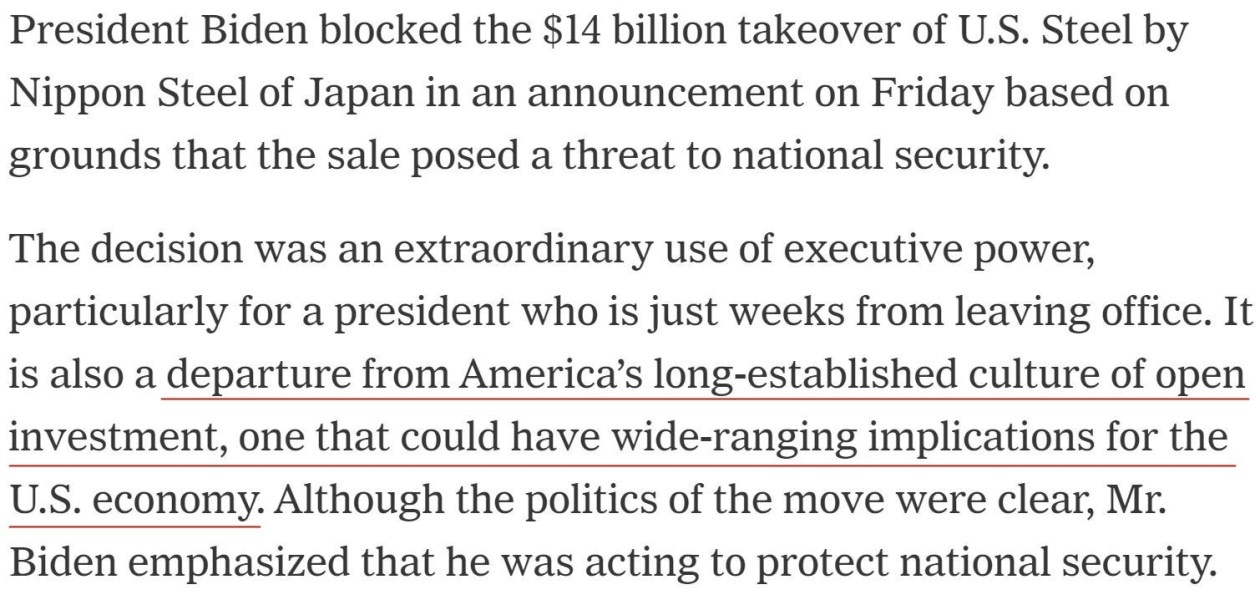 雖然日鐵多次讓步,但美國總統(tǒng)拜登當(dāng)?shù)貢r間3日發(fā)表聲明,正式阻止了這筆價值2萬億日元(按目前匯率約合127億美元)的交易。