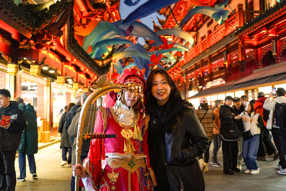 2024年11月30日,來自韓國(guó)的游客(右)在上海豫園商城與游戲角色裝扮者合影。新華社發(fā)(謝鑫 攝)