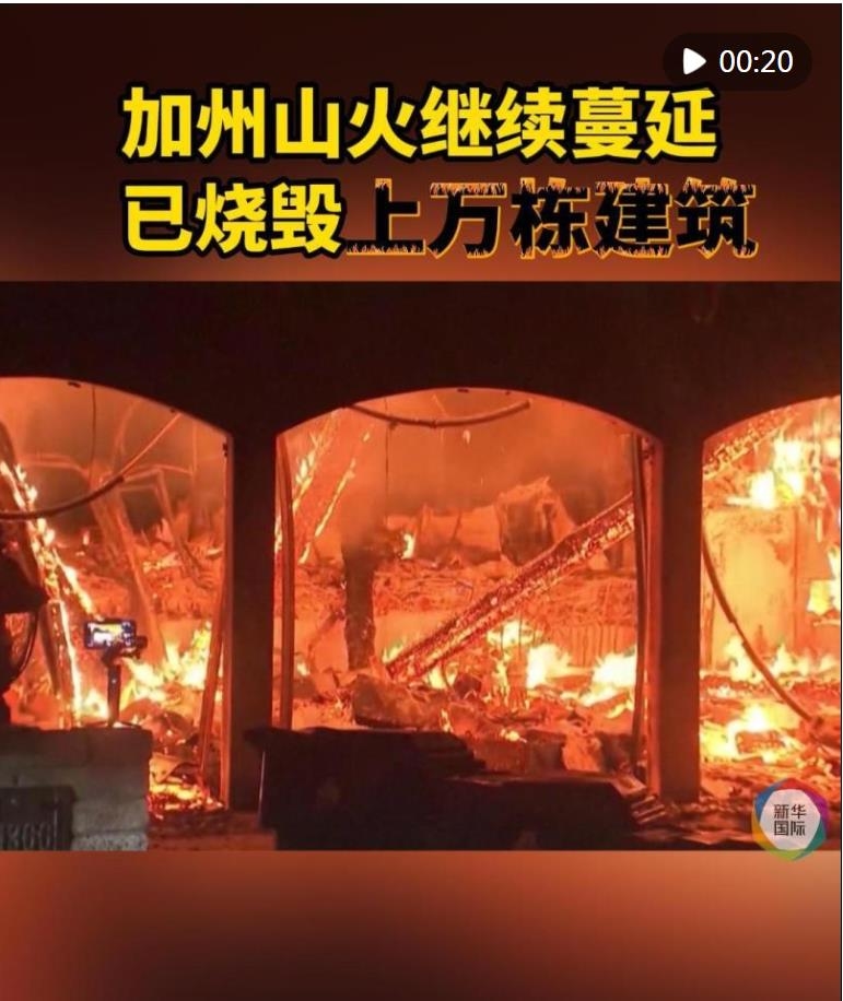美國加利福尼亞州洛杉磯地區(qū)的山火仍在劇烈燃燒。據(jù)當(dāng)?shù)卣?,截?1日,山火已造成16人死亡,另有至少13人失蹤。