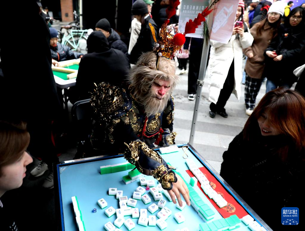 今年,倫敦卡姆登集市首次舉辦了中國春節(jié)慶典活動。喜慶的春節(jié)燈飾高高懸掛,在微風(fēng)中輕輕搖曳;空氣中彌漫著中式點心的香氣,令人垂涎欲滴。人群中,偶爾可見漢服衣袂翩然掠過,許多人手中還拿著紅色的燈籠和“?!弊?。在慶典活動上,當(dāng)?shù)厥忻裾淠荨っ谞栁值乱贿吅爸芭觥?,一邊開心地將麻將桌上的“南風(fēng)”牌收到面前。她不僅自己打得得心應(yīng)手,還不時給身邊的新手講解規(guī)則。