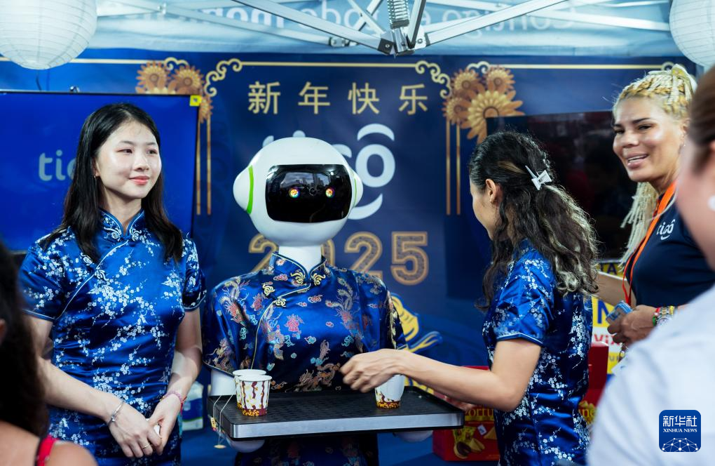 1月31日,在巴拿馬首都巴拿馬城的華僑華人歡樂春節(jié)廟會上,機器人為游客送上中國茶水。新華社記者 許詠政 攝