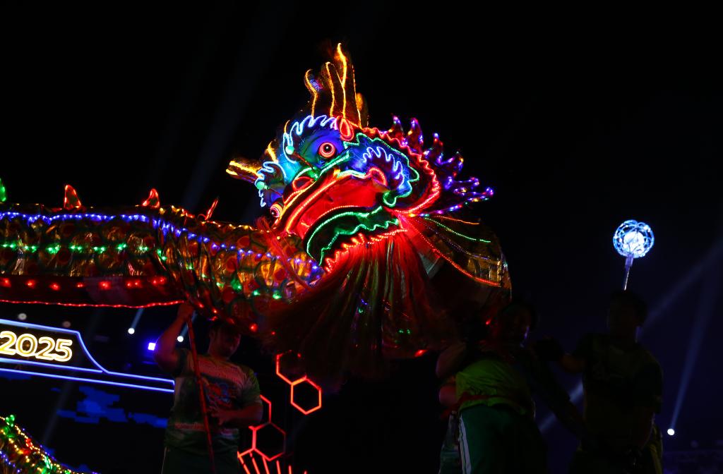 1月26日,演員在泰國那空沙旺湄南河畔舉行的春節(jié)慶祝活動上表演舞龍。新華社記者孫瑋彤?dāng)z