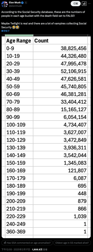 馬斯克周一公布了美國社保數(shù)據(jù)庫中,每個年齡段中“是否死亡”字段設置為否的人數(shù)。其中存在兩個問題:人數(shù)對不上和年齡太離譜。