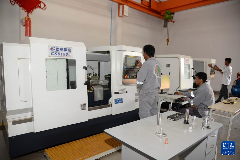 2月10日,在馬達加斯加首都塔那那利佛的魯班工坊,機械工程專業(yè)學生進行數(shù)控機床的教學實踐。新華社發(fā)(西塔卡·拉喬納里松攝)
