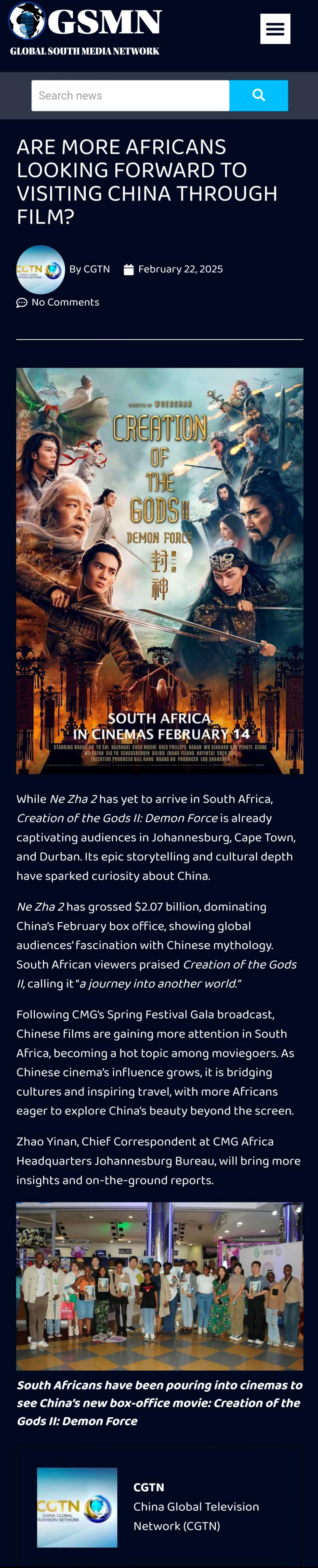 總臺(tái)記者在南非約翰內(nèi)斯堡街頭采訪時(shí)發(fā)現(xiàn),隨著《哪吒2》《封神第二部:戰(zhàn)火西岐》《唐探1900》等中國(guó)電影的熱映,非洲觀眾對(duì)中國(guó)文化和旅游的興趣日益濃厚。許多年輕觀眾認(rèn)為,中國(guó)電影的敘事風(fēng)格、視覺特效和文化內(nèi)涵讓他們對(duì)中國(guó)歷史、神話以及現(xiàn)代社會(huì)充滿好奇。