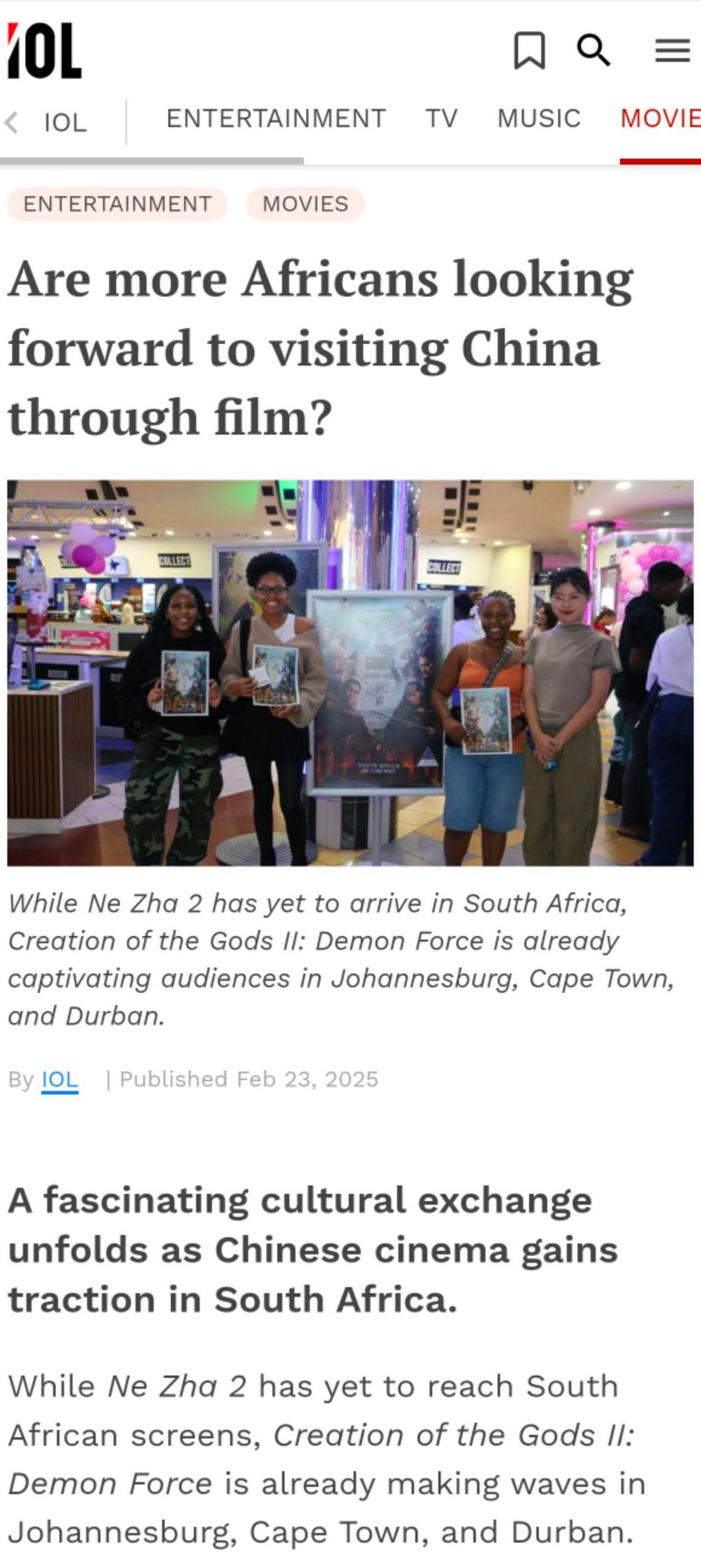 中國(guó)電影走進(jìn)非洲,走過“零的突破”,如今實(shí)現(xiàn)了高質(zhì)量推進(jìn)。近期隨著2025年蛇年春節(jié)檔中國(guó)影片在南非公映,越來越多的非洲伙伴走進(jìn)影院感受中國(guó)電影帶來的震撼。