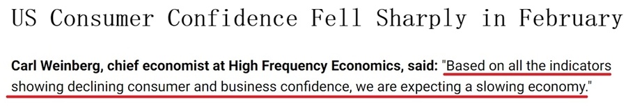 紐約高頻經(jīng)濟公司首席經(jīng)濟學家卡爾 溫伯格在給客戶的一份報告中直言:“基于所有顯示消費者和企業(yè)信心下降的指標,我們預計美國經(jīng)濟將放緩。”