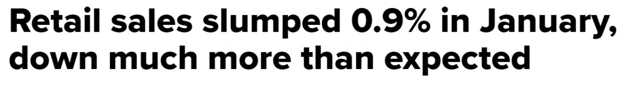 與此相應地,美國1月零售額環(huán)比下降0.9%,大大超出此前下降0.2%的預期,創(chuàng)下近兩年來的最大月度環(huán)比跌幅。