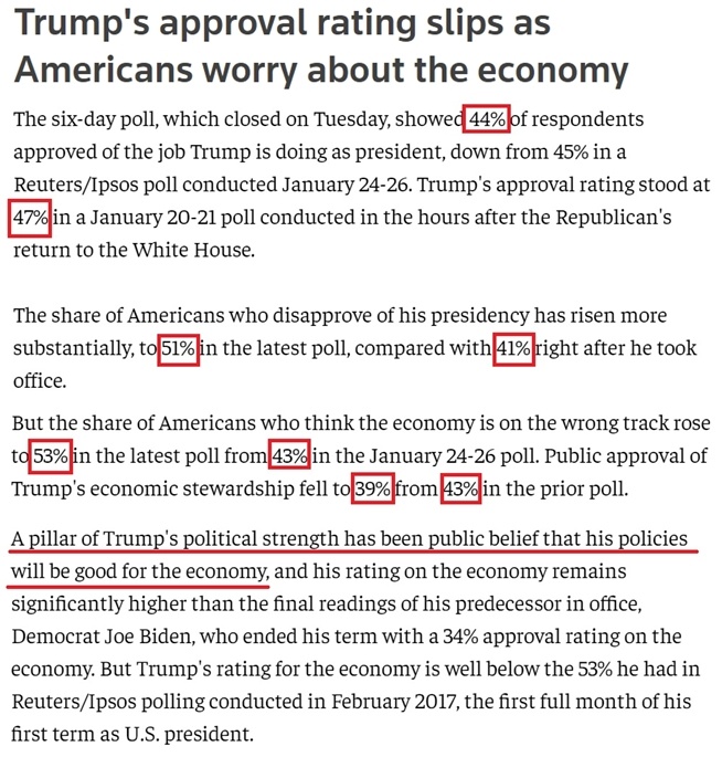 路透社在報道中指出,特朗普政治實力的一個支柱就是不少人相信他的政策對經(jīng)濟有利,而最新民調(diào)結(jié)果顯示,越來越多的美國人因為這位新總統(tǒng)威脅要對外加征關稅而對美國的經(jīng)濟發(fā)展方向感到擔憂。