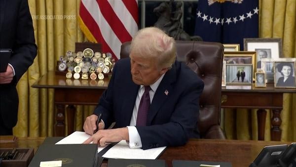 當?shù)貢r間1月20日,特朗普簽署行政命令,要求暫停美國所有對外援助計劃。 美聯(lián)社視頻截圖