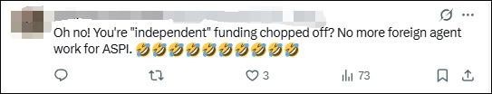 “哦豁!‘獨立智庫’的資金被切斷啦?ASPI這下做不成外國代理人的勾當咯?!?/p>
