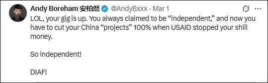 “笑死,你們?nèi)嗽O(shè)崩了。”在中國生活和工作多年的新西蘭媒體人安迪·博勒姆(中文名安柏然)也嘲諷道,“成天標榜自己‘獨立’,現(xiàn)在美國國際開發(fā)署斷了黑錢,對華‘項目’得100%砍光。還真是獨立?。≮s緊涼透吧!”