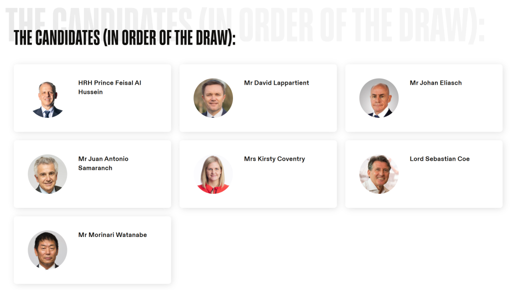 此次國(guó)際奧委會(huì)主席選舉共有創(chuàng)紀(jì)錄的七人參與,包括國(guó)際奧委會(huì)副主席小薩馬蘭奇,國(guó)際奧委會(huì)執(zhí)委、運(yùn)動(dòng)員委員會(huì)前主席柯絲蒂·考文垂,世界田聯(lián)主席塞巴斯蒂安·科,國(guó)際自行車聯(lián)盟主席大衛(wèi)·拉帕爾蒂安,國(guó)際雪聯(lián)主席約翰·埃利亞施,國(guó)際奧委會(huì)執(zhí)委費(fèi)薩爾·侯賽因和國(guó)際體操聯(lián)合會(huì)主席渡邊守成。