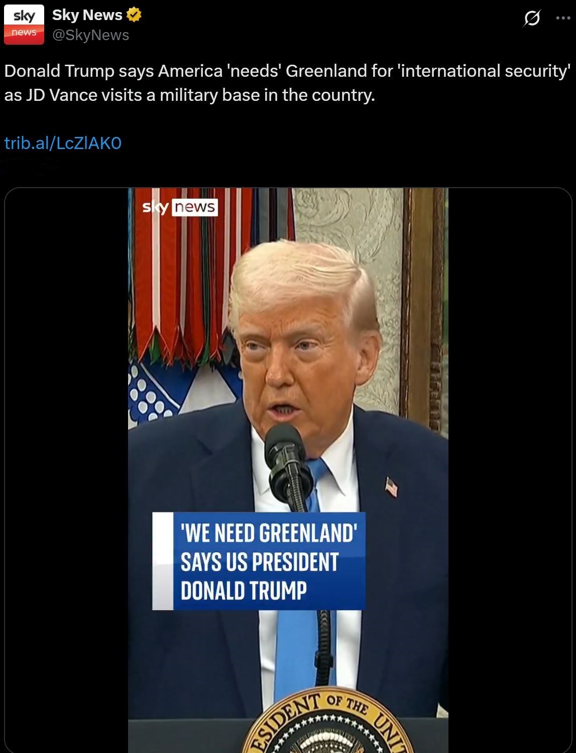 “格陵蘭島對于美國的安全至關重要,而它現(xiàn)在非常脆弱。如果格陵蘭島人民愿與美國合作,而且我也認為他們最終會與美國合作,我們可以讓他們更安全?!?/p>