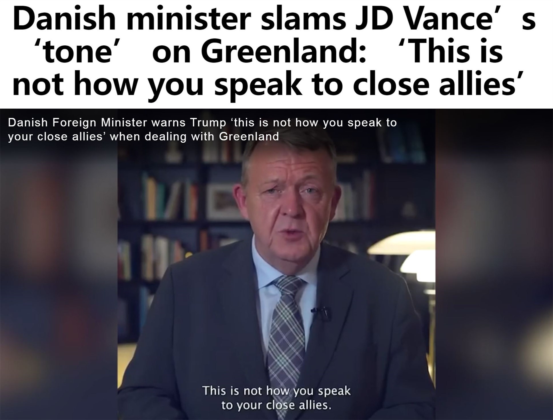 丹麥外交大臣拉斯穆森29日在社交媒體上發(fā)表視頻講話,批評萬斯有關格陵蘭島表態(tài)的“調(diào)調(diào)”。