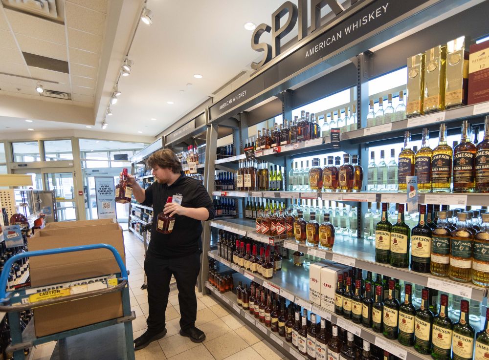 2025年3月4日,在加拿大安大略省的奧克維爾,一酒商門店的店員從貨架上撤下美國品牌酒產品。新華社發(fā)(鄒崢攝)