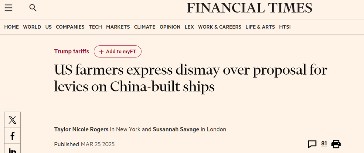 另據(jù)英國《金融時(shí)報(bào)》報(bào)道,美國中西部農(nóng)民非常擔(dān)憂,加征“港口費(fèi)”必將進(jìn)一步削弱農(nóng)產(chǎn)品出口競(jìng)爭(zhēng)力。美國大豆出口委員會(huì)首席執(zhí)行官吉姆·薩特表示,整個(gè)行業(yè)對(duì)提案“措手不及”。