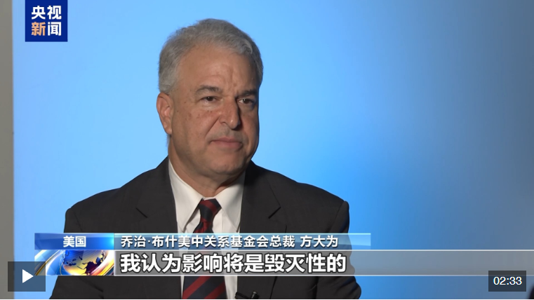 喬治·布什美中關系基金會總裁方大為6日在接受央視記者專訪時表示,美國政府新關稅政策的影響將是毀滅性的,不僅會使美國經(jīng)濟面臨更大的風險,引發(fā)的經(jīng)濟衰退更是對全球貿(mào)易體系的破壞?!?