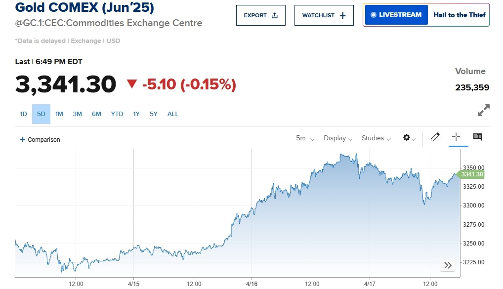 近期受美關(guān)稅政策影響,市場恐慌情緒蔓延,投資者投資策略偏向避險(xiǎn),進(jìn)而拉升國際金價(jià)的走高。美東時(shí)間4月18日,美國紐約商品交易所6月黃金期貨價(jià)格收于每盎司3341.30美元,較前一日小幅下跌,但仍處于高位。