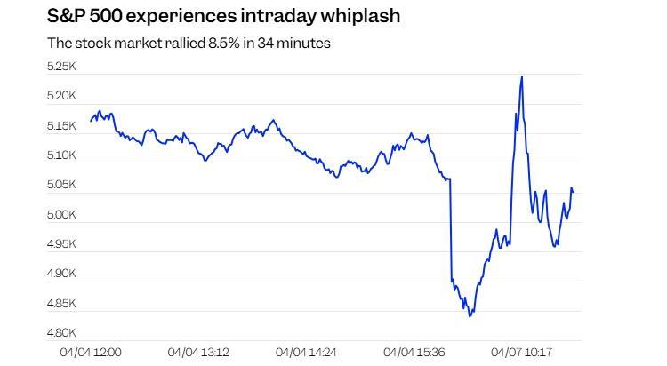 標(biāo)普500指數(shù)在7日開盤暴跌后不久,因?yàn)椤凹傩侣劇庇绊?,?4分鐘內(nèi)大漲8.4%,但在收盤時(shí)盡數(shù)吐出。