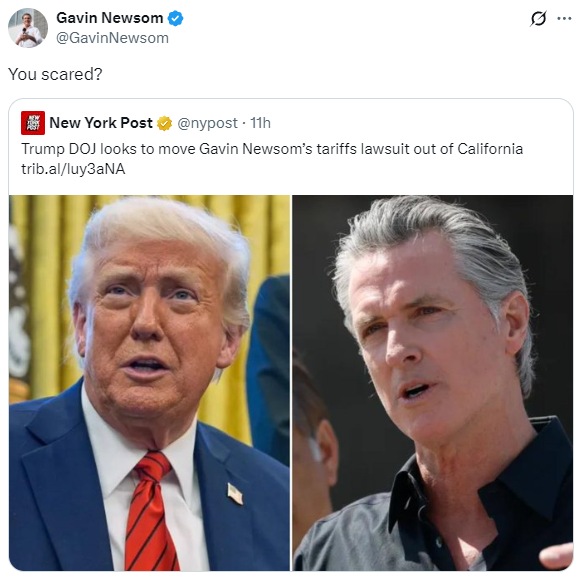 18日,美國加州州長加文·紐森在社交媒體上發(fā)聲,他轉(zhuǎn)發(fā)了一則《紐約郵報(bào)》的新聞消息。這則新聞標(biāo)題為《特朗普的司法部似乎希望把紐森關(guān)稅訴訟的審理地挪出加州》。紐森在轉(zhuǎn)發(fā)消息時(shí)附加了一句評論:“你害怕了嗎?”
