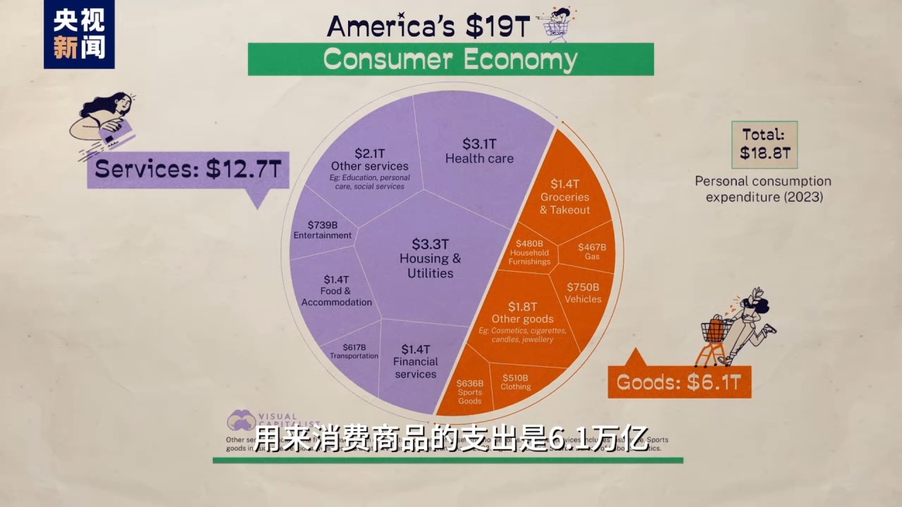 按美國勞動(dòng)局?jǐn)?shù)據(jù),美國人2023年消費(fèi)支出18.8萬億美元,其中12.7萬億花在了看病、租房、交學(xué)費(fèi)、打官司等服務(wù)上,用來消費(fèi)商品的支出是6.1萬億,不到總消費(fèi)的三分之一。所以吹噓美國消費(fèi)能力強(qiáng)屬實(shí)是個(gè)“地獄笑話”,看病花錢多有什么可驕傲的?