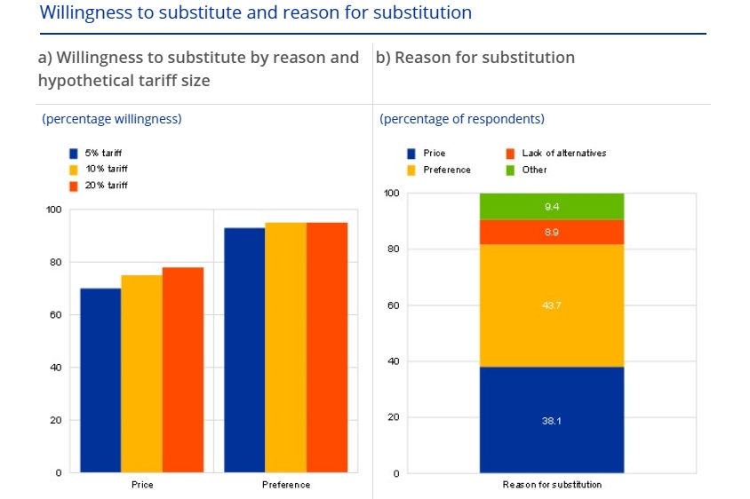 歐洲央行在4月底的博文中還提到,通常情況下,關(guān)稅對(duì)消費(fèi)者的影響程度取決于受影響產(chǎn)品和服務(wù)的需求價(jià)格彈性,即如果價(jià)格上漲,消費(fèi)者可能會(huì)轉(zhuǎn)向更便宜的替代品。然而,近期美國(guó)的關(guān)稅可能會(huì)導(dǎo)致更廣泛的偏好轉(zhuǎn)變,使歐洲人完全放棄美國(guó)產(chǎn)品和品牌,不論價(jià)格如何變化。