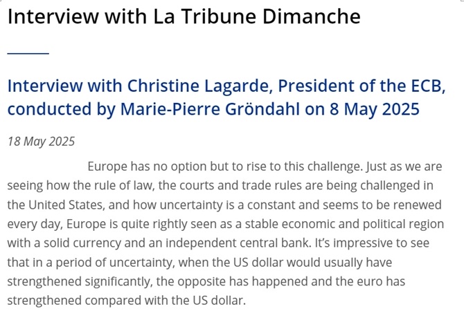 歐洲央行行長拉加德日前接受采訪時也表示,近期歐元對美元走強看似有悖直覺,其實源于金融市場對美國失去了信心。這是美國反復無常的關(guān)稅等政策造成的,“對歐洲來說是一個機遇”。