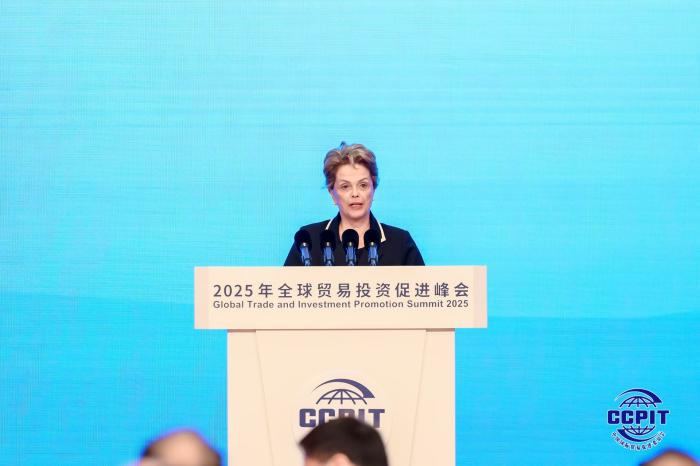 5月22日,由中國(guó)貿(mào)促會(huì)主辦的2025年全球貿(mào)易投資促進(jìn)峰會(huì)在北京舉行。新開(kāi)發(fā)銀行行長(zhǎng)、巴西前總統(tǒng)迪爾瑪·羅塞芙在開(kāi)幕式致辭。中國(guó)貿(mào)促會(huì)供圖