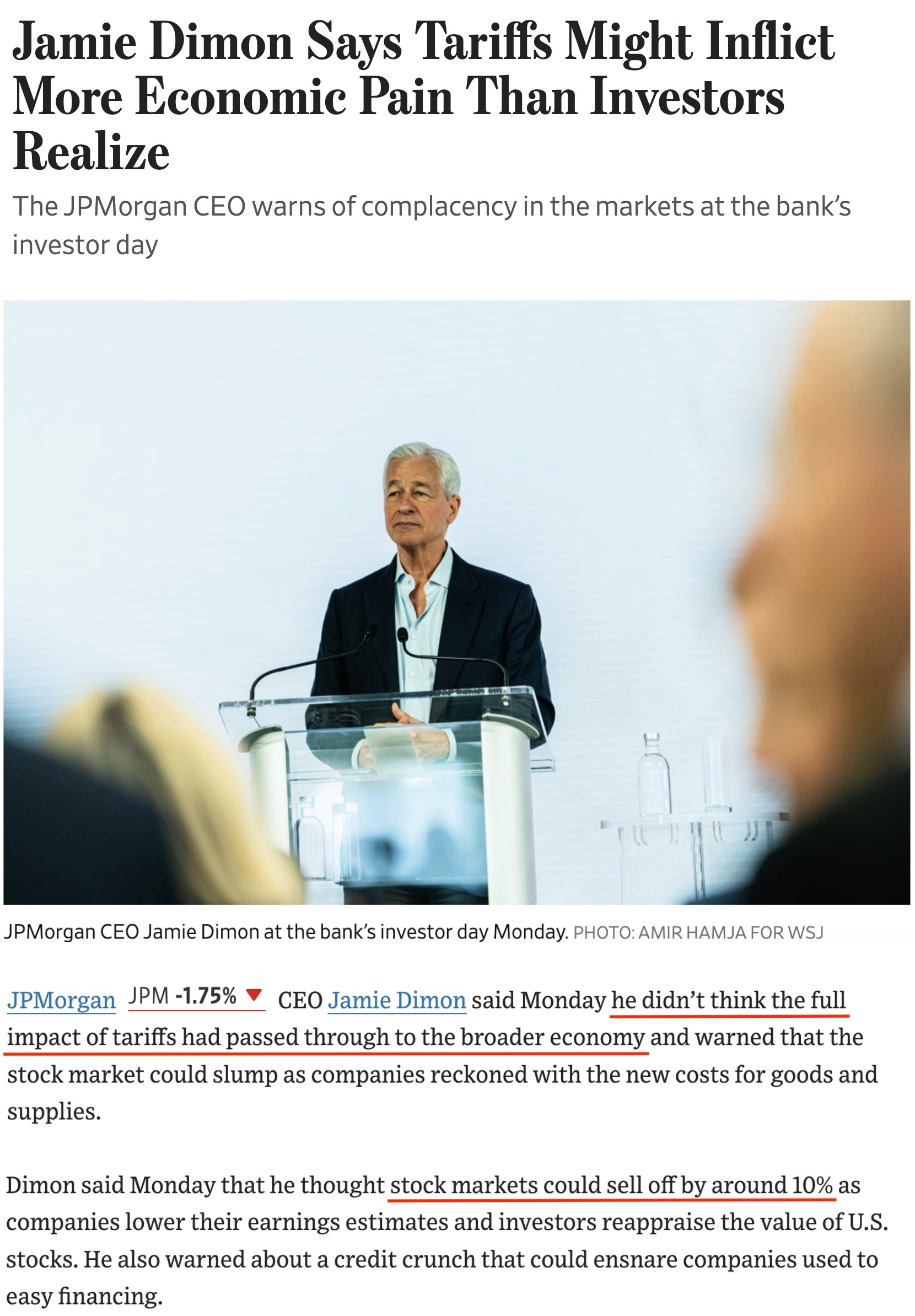 摩根大通公司首席執(zhí)行官杰米·戴蒙近日指出,關(guān)稅的全部影響尚未傳導(dǎo)至整體經(jīng)濟(jì),通脹加劇和滯脹的可能性比人們認(rèn)為的要大,隨著企業(yè)下調(diào)利潤預(yù)期以及投資者重新評估美國股票的價(jià)值,股市可能下跌約10%。