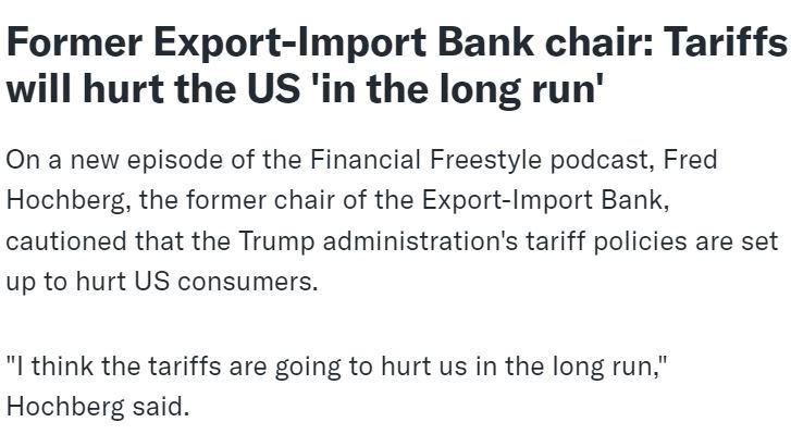 美國進(jìn)出口銀行前行長弗雷德·霍奇伯格也曾警告稱,美國政府的關(guān)稅政策將對美國經(jīng)濟(jì)和消費(fèi)者造成長期傷害。