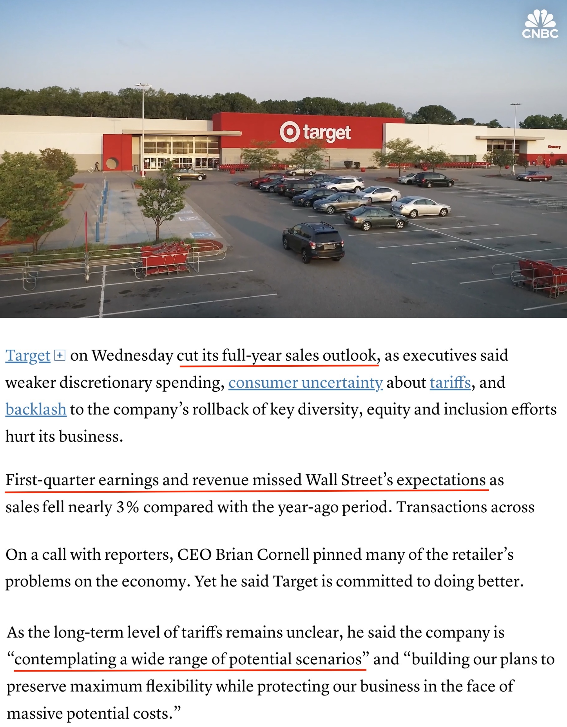 美國知名零售商塔吉特百貨公司第一季度的收益和收入均低于預(yù)期。由于業(yè)務(wù)受到關(guān)稅的不確定性等因素?fù)p害,該公司21日下調(diào)了全年銷售預(yù)期。