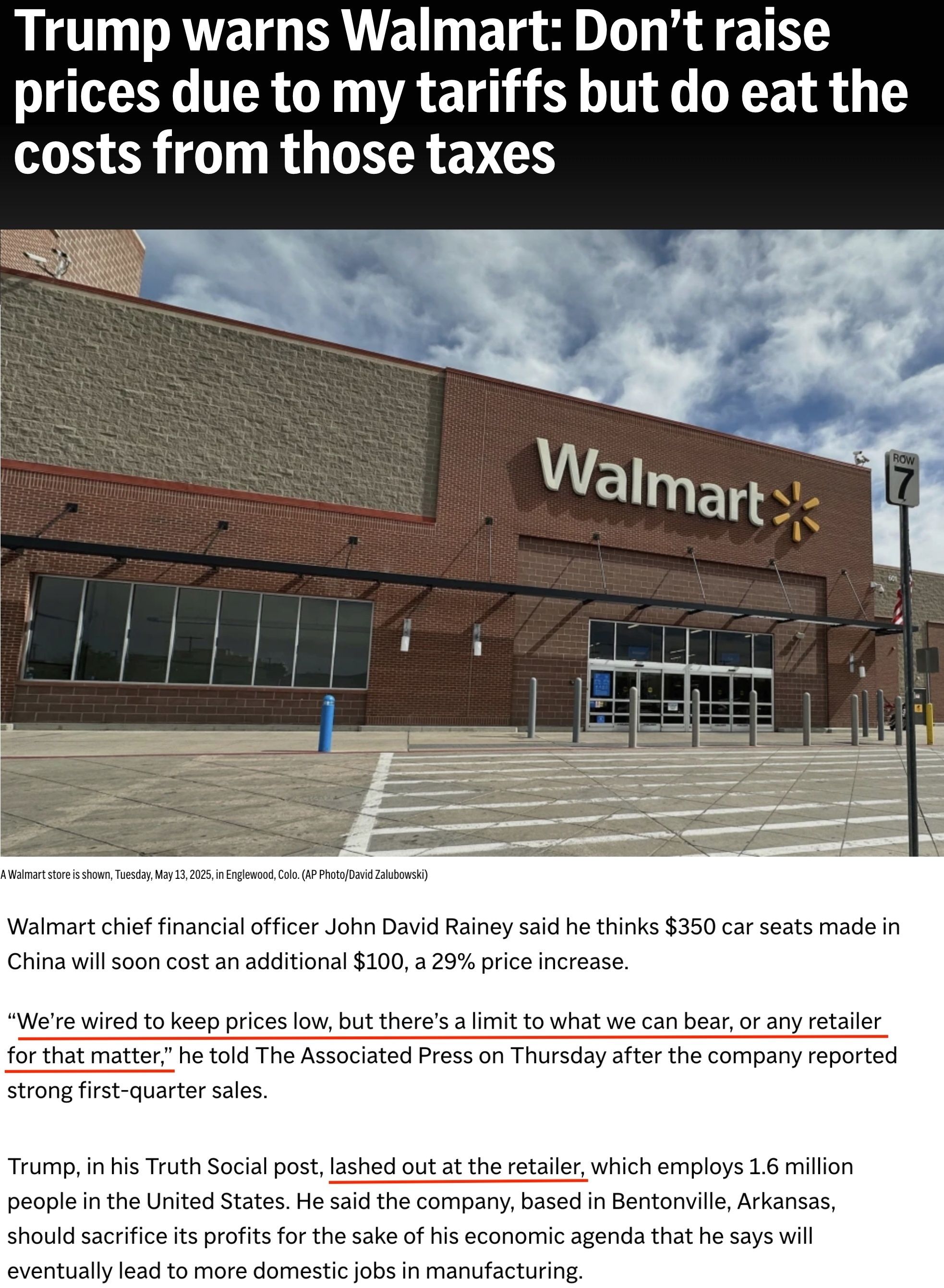 美國最大零售業(yè)企業(yè)沃爾瑪?shù)臐q價(jià)預(yù)告甚至惹惱了總統(tǒng)特朗普。特朗普在社交媒體上發(fā)文抨擊沃爾瑪將全面漲價(jià)歸咎于關(guān)稅,稱該公司應(yīng)該承擔(dān)美國關(guān)稅政策所帶來的額外成本,而不是向顧客收費(fèi)。
