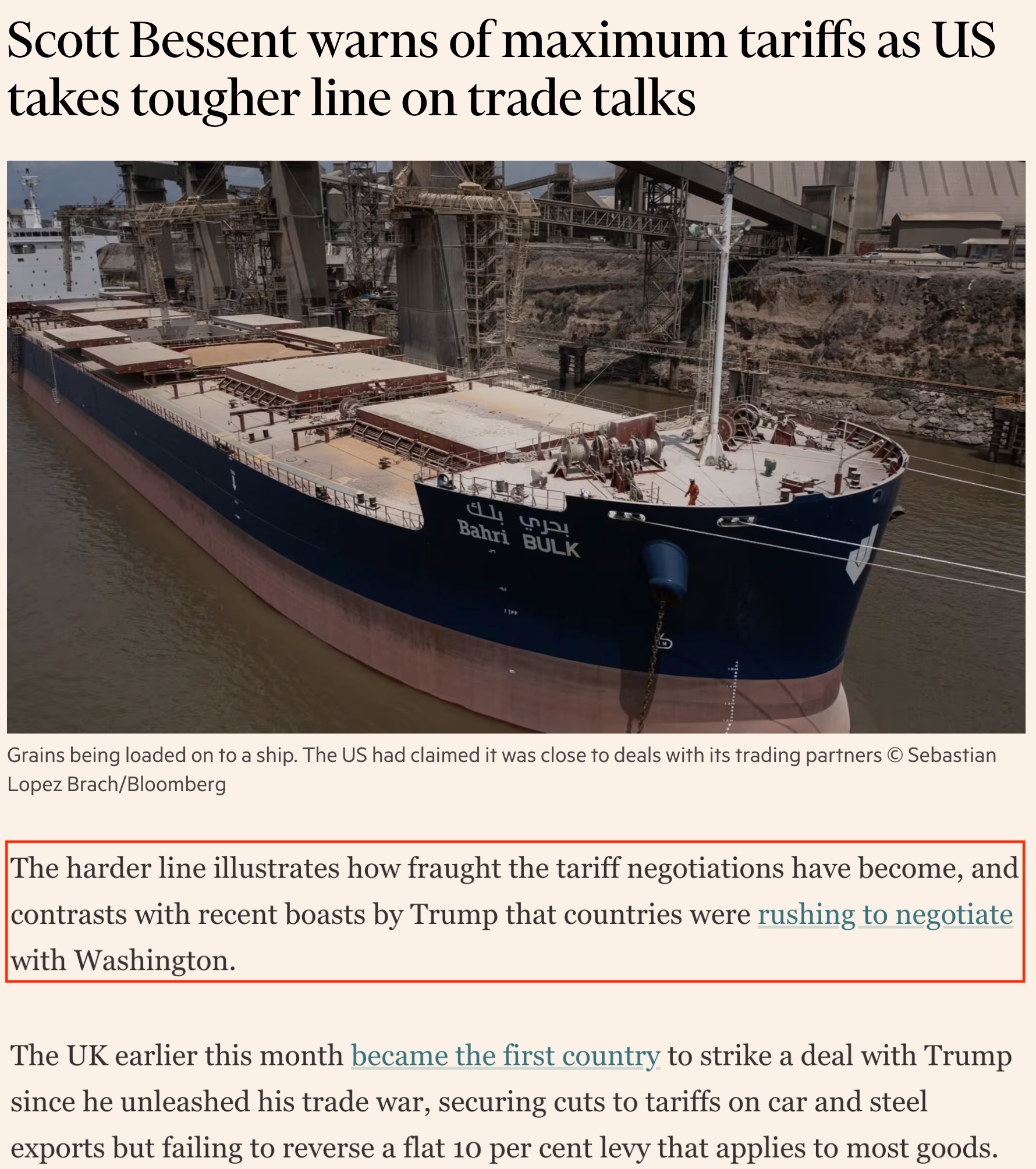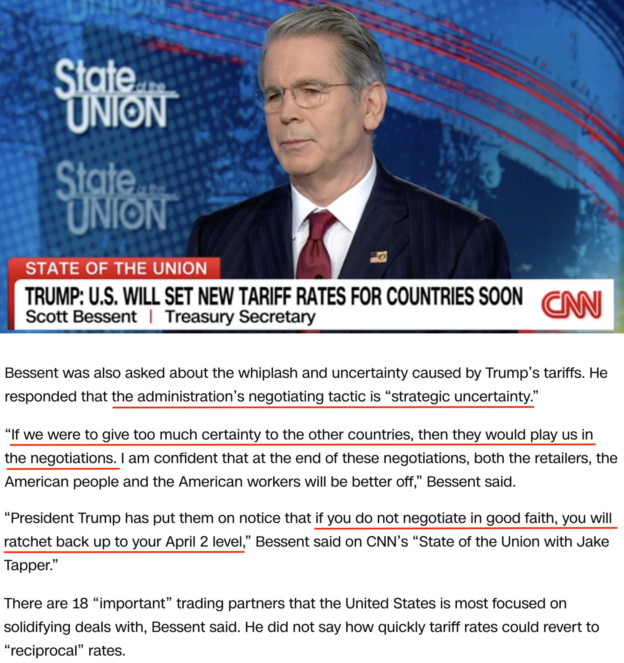 貝森特表示,美國政府正專注于與18個(gè)最重要的貿(mào)易伙伴,如果對方?jīng)]有“誠意”,他們的關(guān)稅稅率將回到4月2日的“對等”水平。
