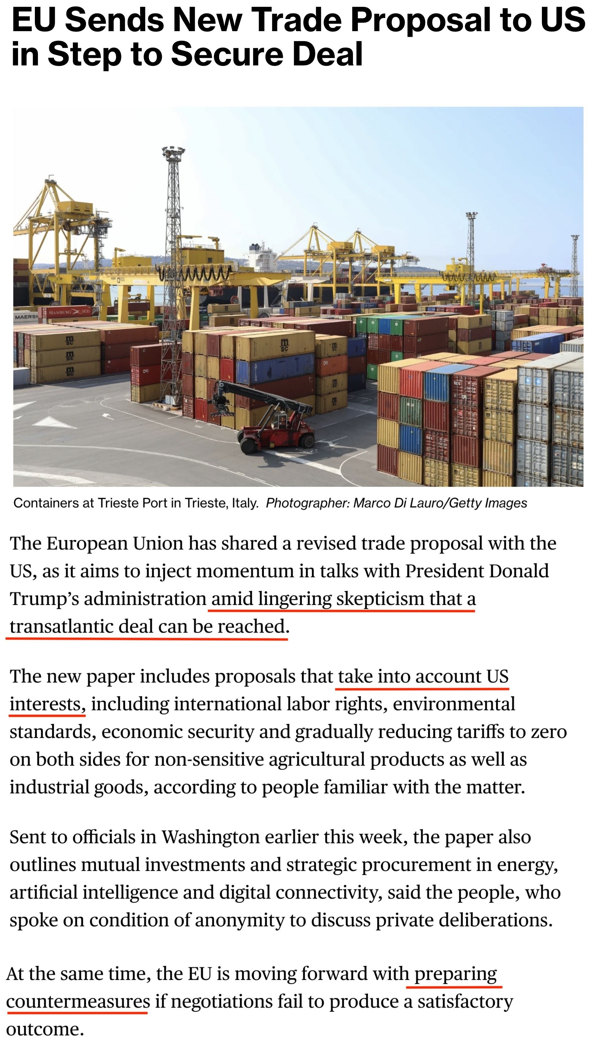 新提案包含了考慮美國利益的提議,包括國際勞工權(quán)利、環(huán)境標(biāo)準(zhǔn)、經(jīng)濟(jì)安全,并逐步將雙方非敏感農(nóng)產(chǎn)品以及工業(yè)品的關(guān)稅降至零。另外還涉及在能源、人工智能和數(shù)字互聯(lián)領(lǐng)域的相互投資和戰(zhàn)略采購等。