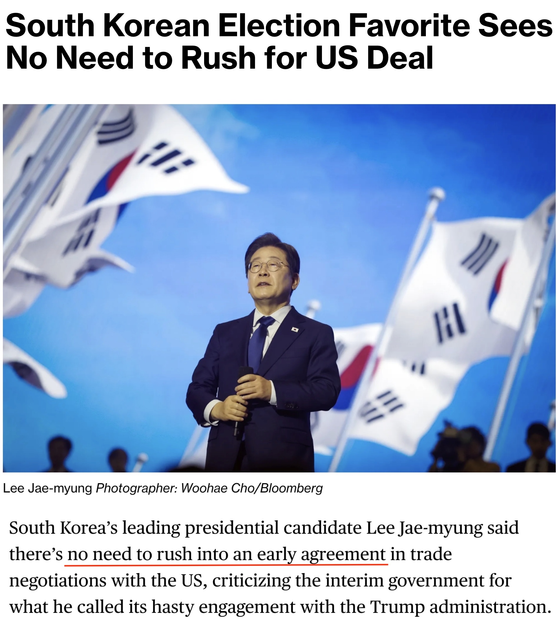 彭博社指出,盡管官員們不愿公開表示他們的態(tài)度變得強(qiáng)硬,但有跡象表明,一些國家已經(jīng)意識到手中的牌比之前認(rèn)為的多,因此可以放慢談判的步伐。比如目前韓國民調(diào)領(lǐng)先的總統(tǒng)候選人李在明就表示,沒必要急于與美國達(dá)成貿(mào)易協(xié)議。