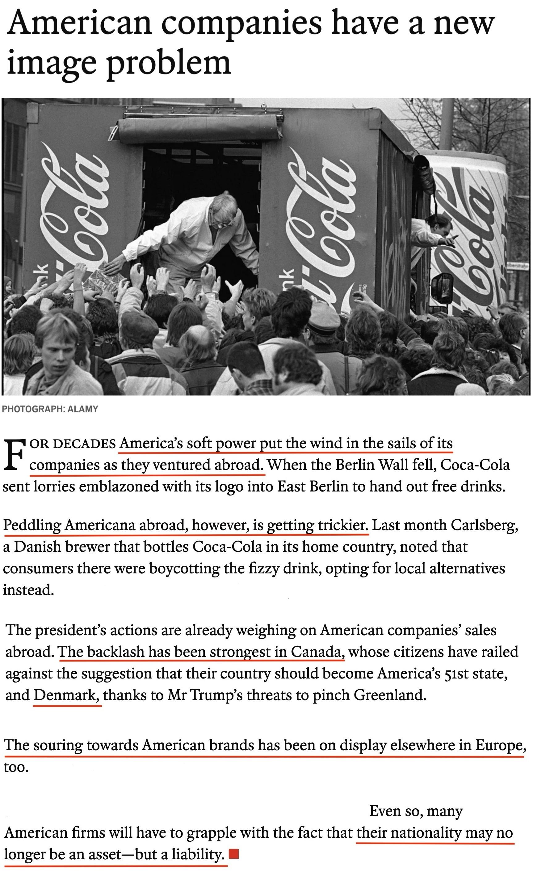 美國的行為已經(jīng)開始影響美國公司的海外銷售額。被美國威脅吞并領(lǐng)土的加拿大和丹麥的抵制情緒最強(qiáng)烈。不僅如此,歐洲其他地區(qū)的消費(fèi)者對美國品牌的反感也顯現(xiàn)出來。