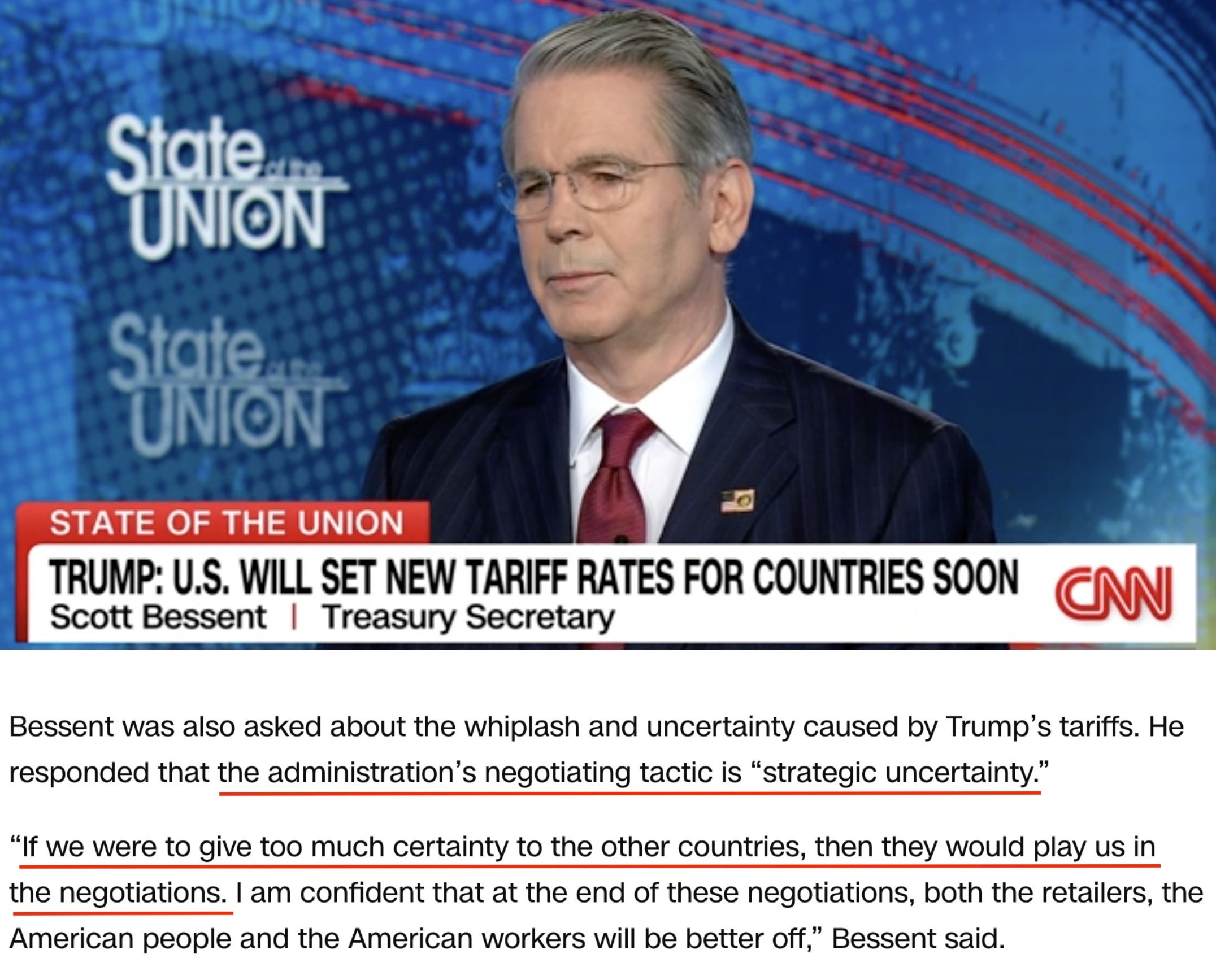 說到美國關(guān)稅的不確定性,美國財長貝森特近日接受采訪時曾有過一番“高論”。據(jù)他稱,在美國與貿(mào)易伙伴展開關(guān)稅談判之際,美國政府表現(xiàn)出的“戰(zhàn)略不確定性”是一種談判策略,而非缺點。