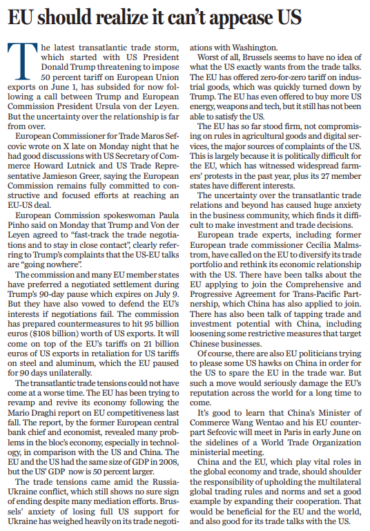 雙方通話后,特朗普宣布將對歐盟征收50%關(guān)稅的期限延后至7月9日,歐盟委員會及部分歐盟成員希望能在此期間敲定協(xié)議,但也同時表示,如果談判失敗,將堅決維護歐盟利益。歐盟委員會已經(jīng)做好準備,將額外對價值950億歐元(約合1080億美元)的美國商品征收關(guān)稅。此前,為報復美國對歐盟鋼鋁加征關(guān)稅,歐盟決定向價值210億歐元的美國商品征收關(guān)稅,該反制措施目前已被歐盟暫緩90天執(zhí)行。