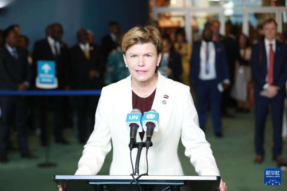 6月3日,在位于紐約的聯(lián)合國(guó)總部,拉脫維亞外長(zhǎng)拜芭·布拉澤在拉脫維亞當(dāng)選聯(lián)合國(guó)安理會(huì)非常任理事國(guó)后講話。新華社記者 謝鍔 攝