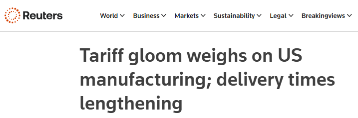 路透社近日的一篇報(bào)道認(rèn)為,美國(guó)制造業(yè)5月連續(xù)第三個(gè)月萎縮,在關(guān)稅影響下,供應(yīng)商交付投入的時(shí)間是近三年來最長(zhǎng)的,這可能預(yù)示著某些商品即將出現(xiàn)短缺。