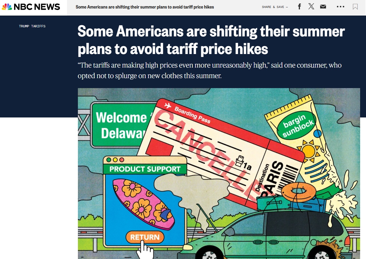 對(duì)于美國(guó)普通消費(fèi)者而言,關(guān)稅也讓他們今年的夏天和往年有所不同。美國(guó)全國(guó)廣播公司網(wǎng)站近日的一篇文章說,美國(guó)政府的關(guān)稅政策,讓美國(guó)消費(fèi)者對(duì)自身成本的擔(dān)憂持續(xù)加劇,他們不得不減少休閑活動(dòng)和購(gòu)物狂歡。