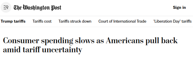 《華盛頓郵報(bào)》報(bào)道稱,由于美國(guó)政府的貿(mào)易戰(zhàn)持續(xù)引發(fā)經(jīng)濟(jì)不確定性,目睹關(guān)稅風(fēng)波的美國(guó)人已開始縮減開支。新數(shù)據(jù)顯示,美國(guó)人購(gòu)買汽車和服裝時(shí)愈發(fā)謹(jǐn)慎。美國(guó)經(jīng)濟(jì)分析局5月30日發(fā)布的數(shù)據(jù)顯示,本就顯疲軟的消費(fèi)支出增長(zhǎng)在4月顯著放緩,因?yàn)楦嗉彝ピ谟^望關(guān)稅相關(guān)的不確定性將如何發(fā)展。