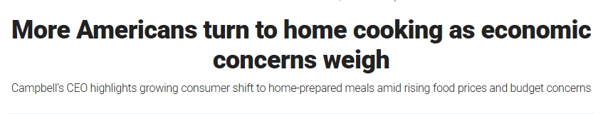 ??怂关?cái)經(jīng)(Fox Business)的報(bào)道援引了罐頭食品生產(chǎn)商金寶湯(Campbell's)首席執(zhí)行官米克·比克胡伊森的話稱,隨著經(jīng)濟(jì)擔(dān)憂加劇,更多美國(guó)家庭選擇在家烹飪以節(jié)省開支。他近期在其公司第三季度財(cái)報(bào)電話會(huì)議上告訴分析師,整個(gè)季度消費(fèi)者情緒持續(xù)疲軟,購(gòu)物者在食品支出上變得更加謹(jǐn)慎。