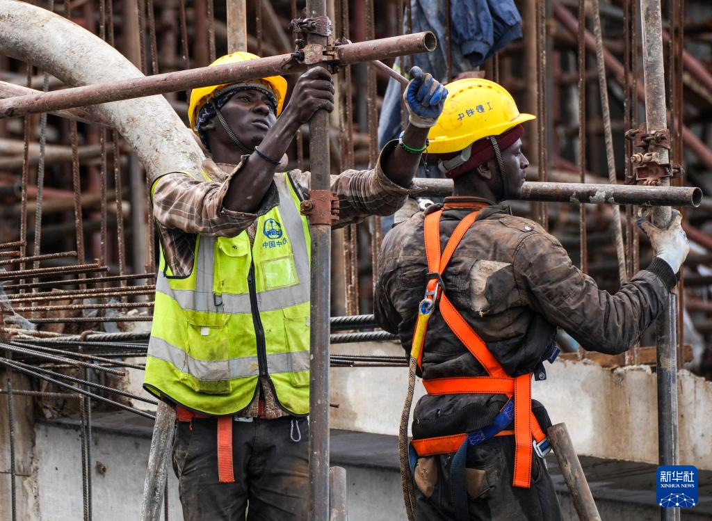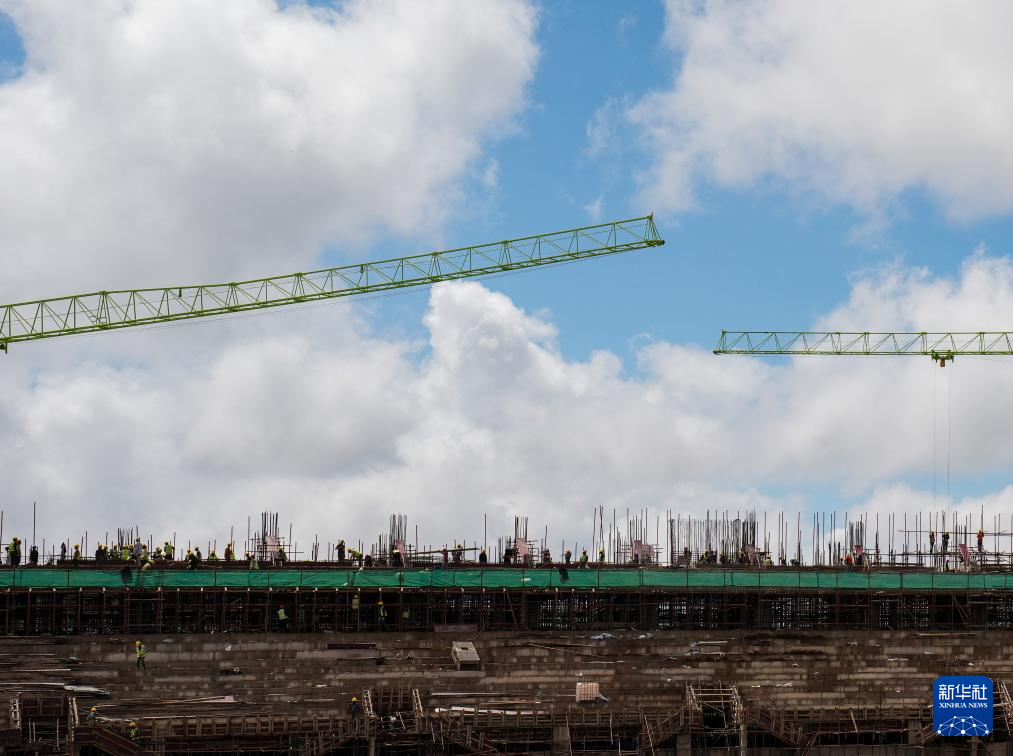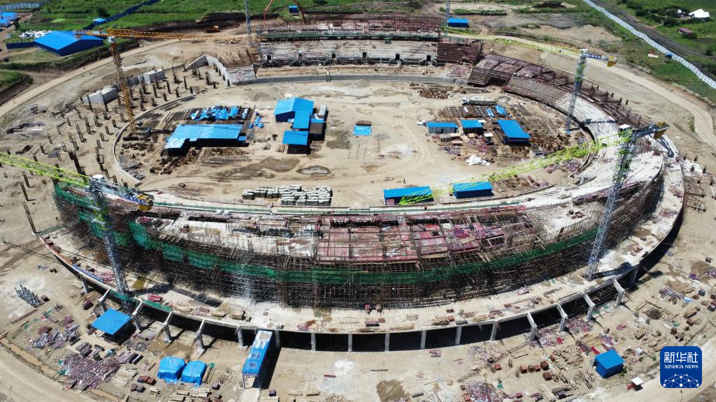這是坦桑尼亞北部城市阿魯沙的一片繁忙工地:六座高聳的塔吊伸展著鋼鐵巨臂,在高空精準吊運建材;焊接聲、機械轟鳴聲與指令聲此起彼伏,交織成一首建設交響曲;上千名工人頭戴安全帽、身著反光背心,正全力拉滿施工“進度條”……一座現(xiàn)代化體育場已初具雛形。